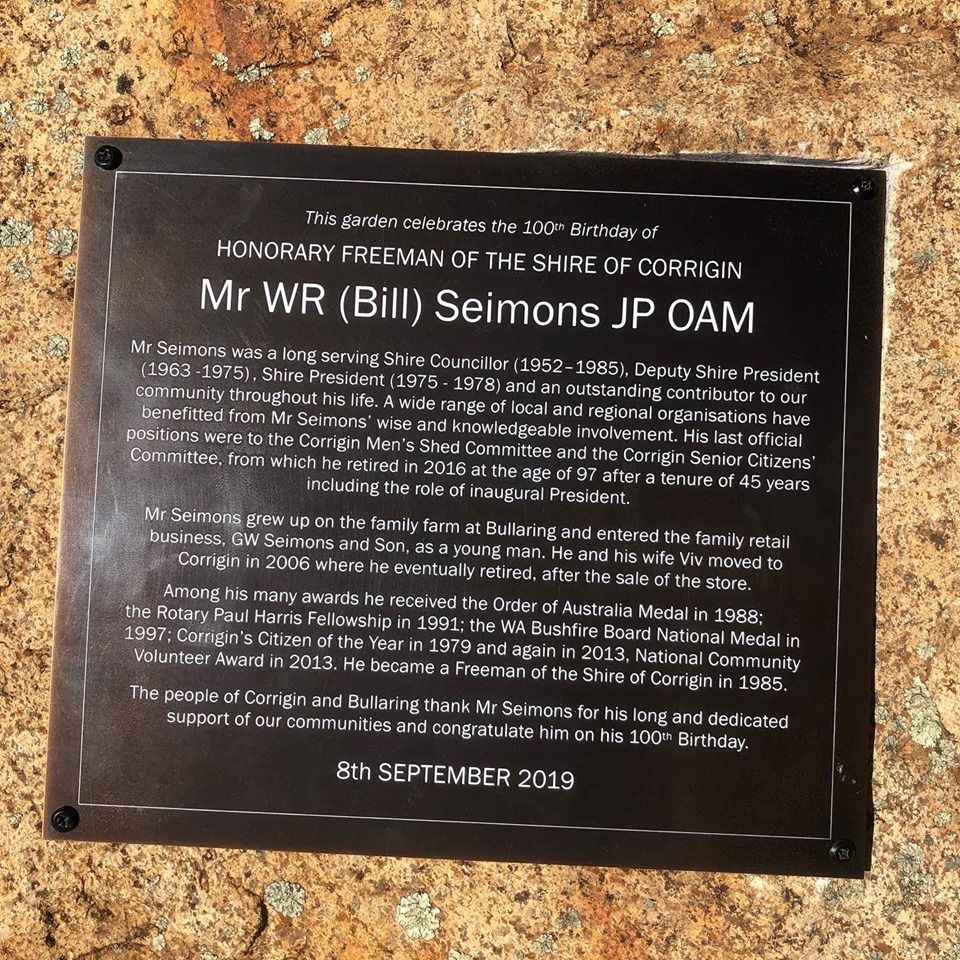 On Sunday 8th September Mr WR (Bill) Seimons turned 100. As a celebration of this milestone and in recognition of the long service Mr Seimons has dedicated to the Shire and many organisations within the Corrigin and Bullaring communities, a new garden bed and plaque at the railway precinct was unveiled by Shire President Lyn Baker, during a small family gathering to honour the 100th Birthday of this amazing gentleman.